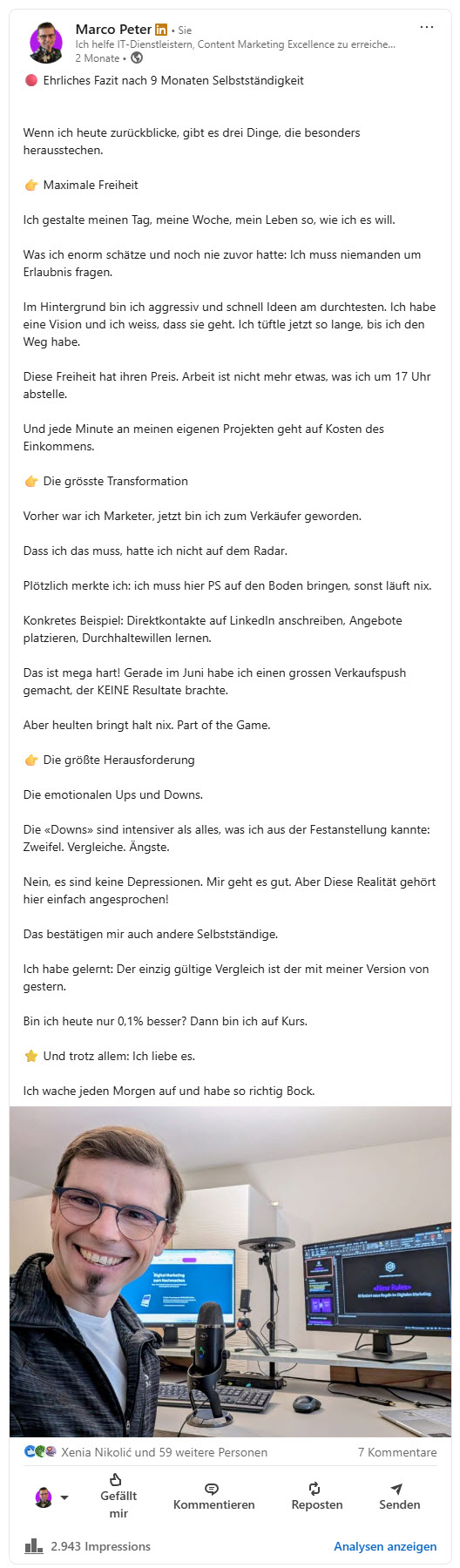 Screenshot aus LinkedIn: Ein ausführlicher Beitrag mit einem Selfie von mir, in welchem ich die ersten 10 Monate Selbständigkeit zusammenfasse. Der Post hat mit fast 3'000 Impressions sehr gut performt.