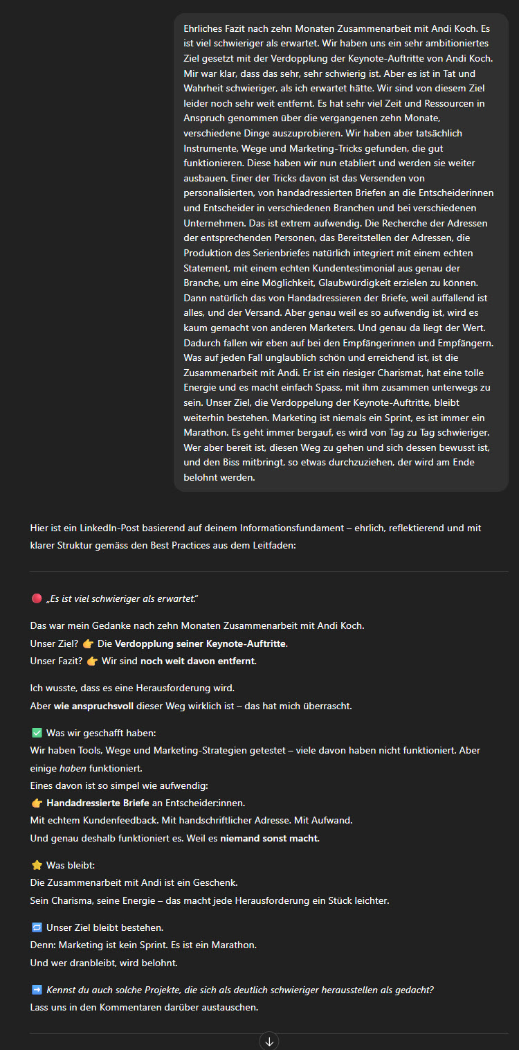 Der Custom GPT verarbeitet die Transkription meiner Sprachnotiz sofort und erstellt innerhalb weniger Sekunden einen vorgängig formatierten LinkedIn-Post. Dabei werden die Inhalte strukturiert, pointiert und sprachlich auf den Punkt gebracht – genau so, wie ich es brauche.