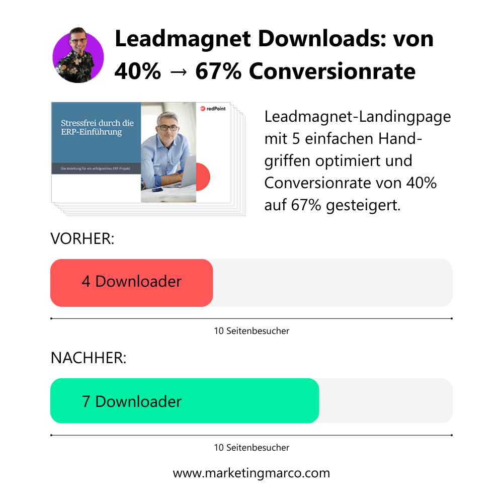 In einem Kundenprojekt für die redPoint AG habe ich die Conversion Rate einer Leadmagnet-Landingpage von 40,9 % auf 67,4 % gesteigert mit fünf gezielten Optimierungen. Der Download betrifft eine 46-seitige Checkliste zur ERP-Einführung, die kostenlos gegen Kontaktdaten abgegeben wird.
